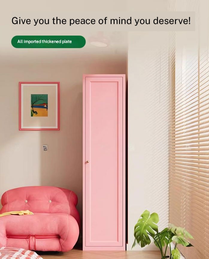 Combining a commanding 71-inch (1800mm) height with a razor-thin 16.6-inch (423mm) width, this cabinet allows developers and designers to provide full-scale wardrobe functionality in footprints previously considered “unusable.” The Sakura Pink finish adds a layer of “Vintage Industrial” charm, making it a favorite for student housing, boutique hotels, and trend-focused workspaces.